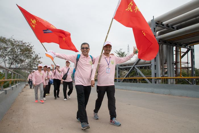 接着,公司董事长、总经理黎广贞和党委书记徐少智为各领队授队旗,全体队员齐声高唱《众和之歌》,歌声嘹亮,响彻全场,引得周围市民纷纷驻足观看。随着公司董事长、总经理黎广贞铿锵有力的一句“向快乐出发,向健康出发,向幸福出发”,徒步活动正式开始。