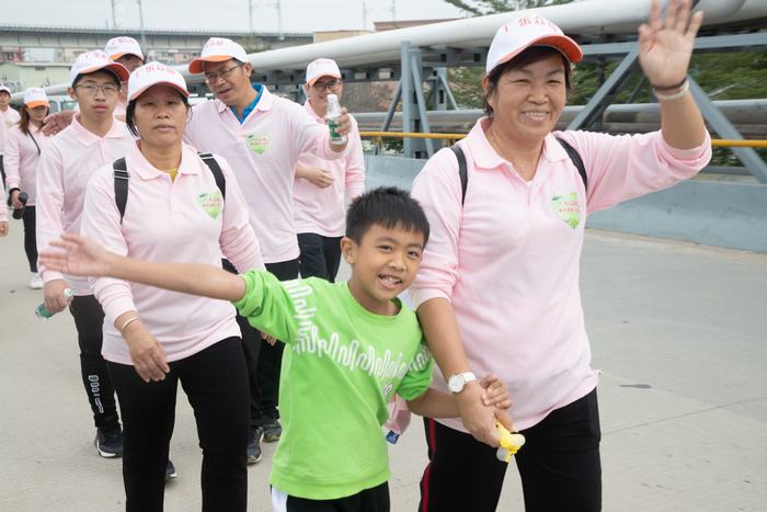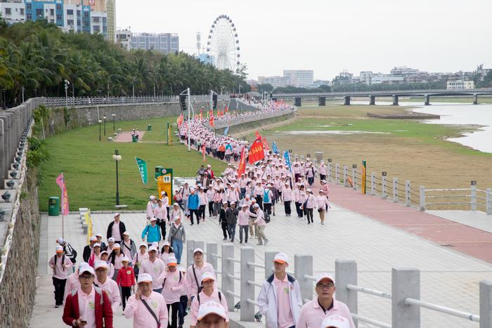 12月的油城,绿树成荫。徒步队员身着粉色上衣,头戴橙白太阳帽,个个精神抖擞,脸上洋溢着幸福的笑容,他们信步走在小东江沿岸的绿道上,高喊着“好心茂名,平安茂名”、“人和家和 幸福众和”口号,为茂名加油!为众和加油!一路上,大家边走边聊,时常用手机拍下美景,欢声笑语相随。长长的徒步队伍如一条美丽的粉红色绸带,在小东江畔飘舞着,与升级改造后的小东江两岸景色相映衬,成为一道靓丽的风景。途中还设置了《众和》杂志、《众和》报相框,引得大家纷纷摆出各种造型,记录美好瞬间。徒步过程中,大家始终保持高涨的热情,相互鼓励,相互帮助,缔结真挚的友谊,他们秉持安全、快乐、有序、文明的八字方针,传播众和精神与文化,体现众和团结与力量。经过近3小时的徒步,徒步队员走完12公里,安全顺利通过凯旋门,最后到达终点。