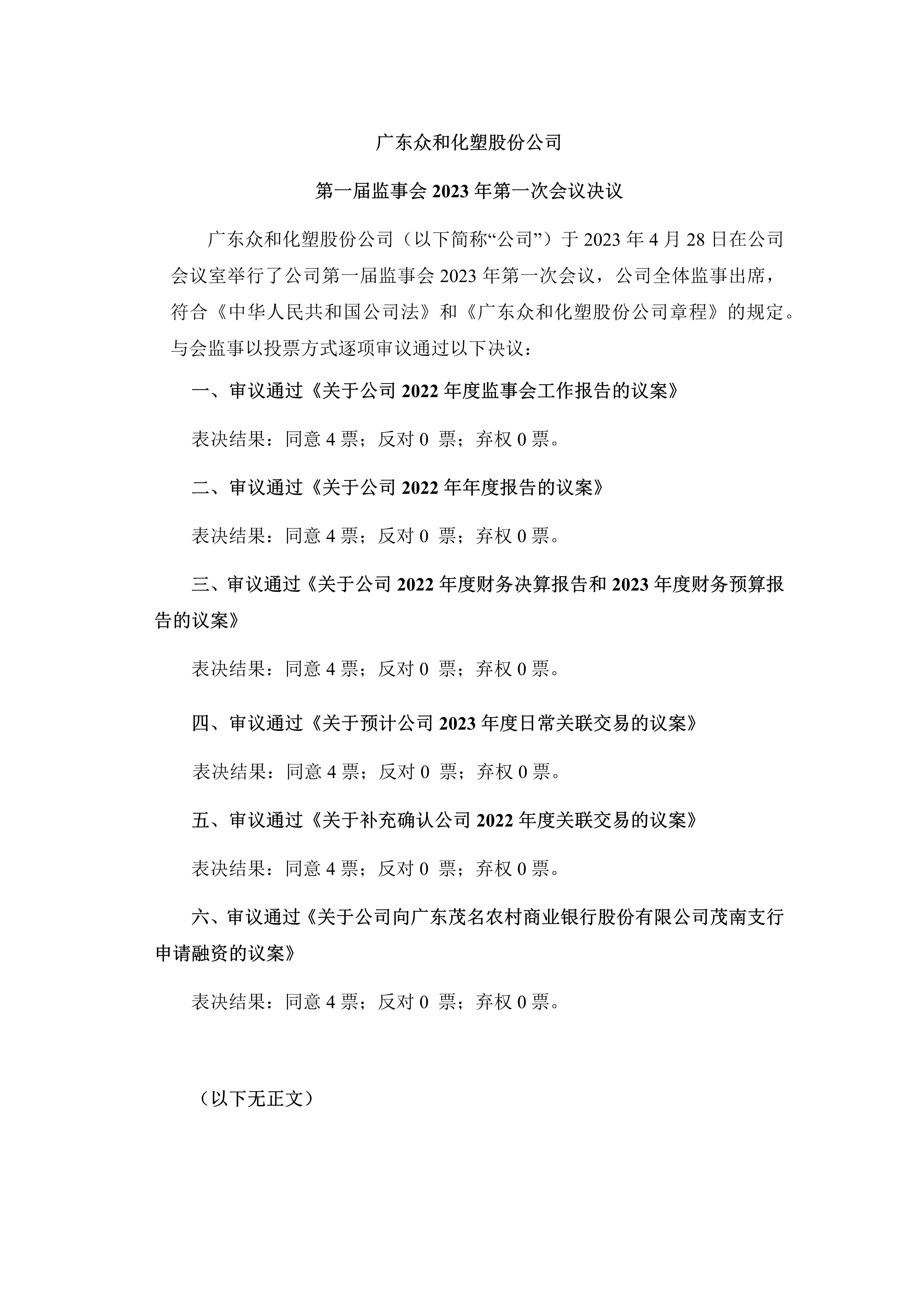 bevictor伟德官网 第一届监事会2023年第一次会议决议